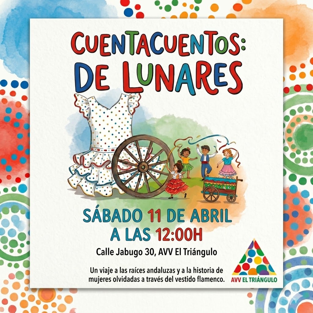 De Lunares: Un viaje a las raíces y al corazón del flamenco para los más pequeños En el marco de nuestras actividades culturales en AVV El Triángulo, tenemos el placer de invitaros a una cita muy especial: el cuentacuentos «De Lunares». No es solo una historia, es un recorrido por la identidad andaluza y un homenaje necesario a las mujeres que, desde la sombra o el arte, construyeron nuestra historia. ¿De qué trata «De Lunares»? Basado en el libro de la autora Lunares Talí, «De Lunares» utiliza el icónico vestido de flamenca como hilo conductor. A través de sus costuras y volantes, los niños y niñas descubrirán la vida de mujeres olvidadas, conectando con sus raíces andaluzas de una forma mágica, visual y emocionante. Es una oportunidad perfecta para que los más pequeños entiendan que el flamenco es mucho más que música: es cultura, es esfuerzo y es memoria. Detalles del evento: Fecha: Sábado 11 de abril. Hora: 12:00h. Lugar: Calle Jabugo 30, sede de la AVV El Triángulo. Edad recomendada: Infantil/Primer ciclo Primaria Venid a disfrutar de una mañana diferente donde los lunares nos contarán secretos que no aparecen en los libros de texto tradicionales. ¡Familias, os esperamos para celebrar nuestra cultura juntas!